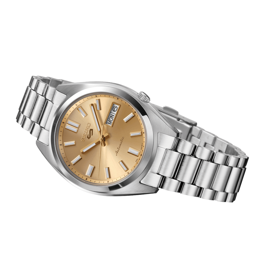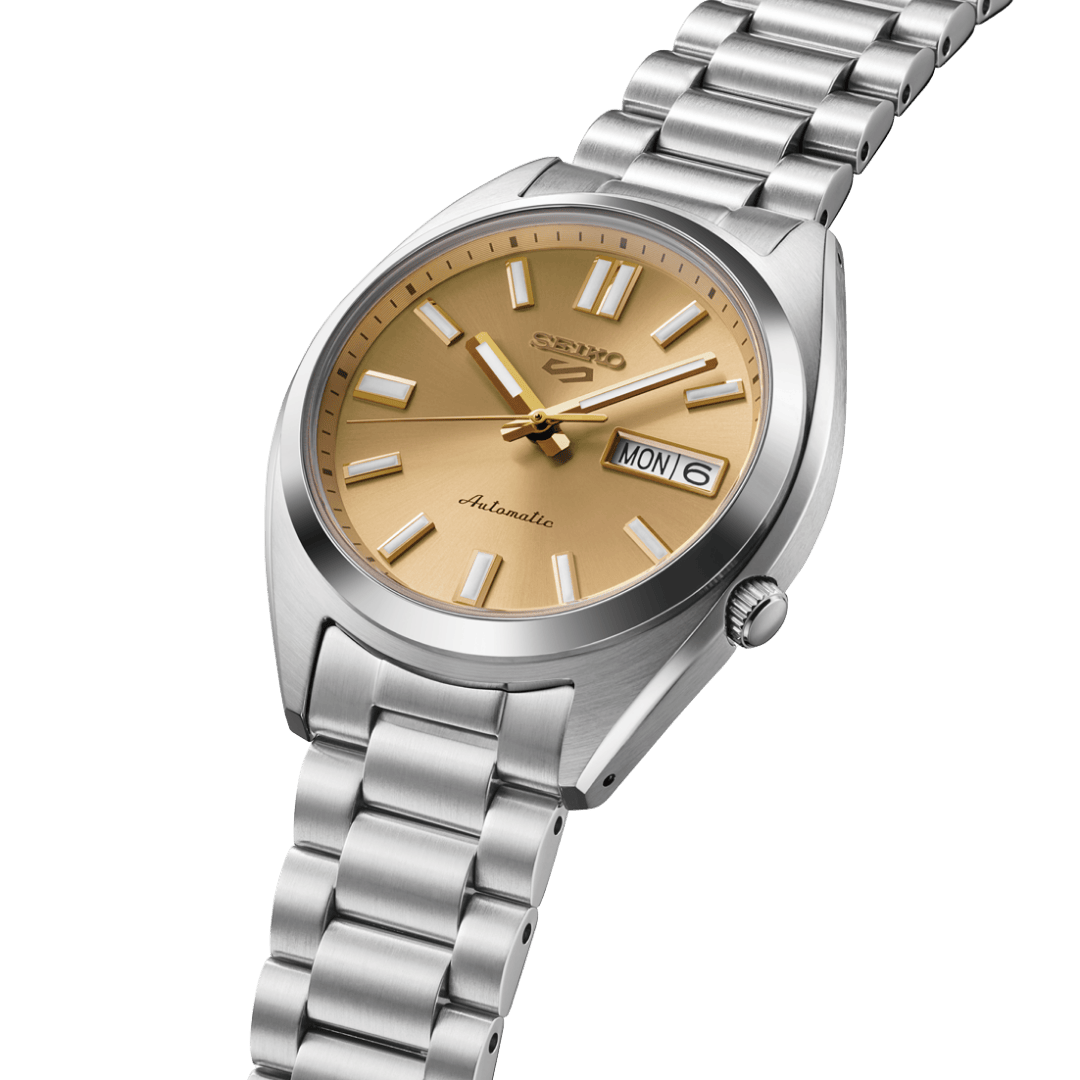 Muški ručni sat SRPL59K1 brenda SEIKO dolazi s kućištem i narukvicom od nehrđajućeg čelika srebrne boje, dok zlatni brojčanik daje satu izražen i klasičan izgled. Opremljen je automatskim mehanizmom, a promjer kućišta od 37 mm čini ga uravnoteženim izborom za svakodnevno nošenje.